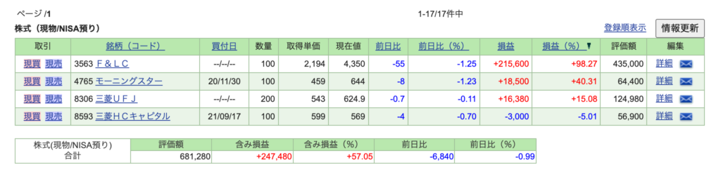 ケイアイスター不動産(3465)、オーケストラHD(6533)、チャームケア(6061)はすべて売却。