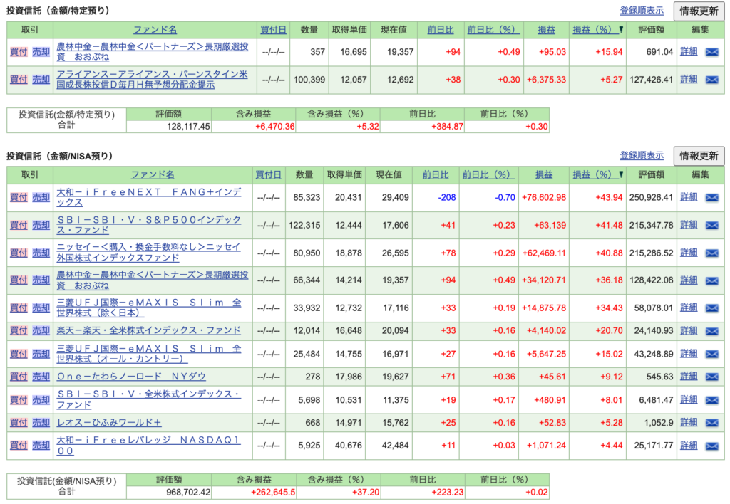 追加したナスレバ(iFree NASDAQ 100)は投資期間にしてはいい成績だと思いますが、レバレッジでどこまでリスクを取るか悩みどころです。現在は積立銘柄に追加してます。